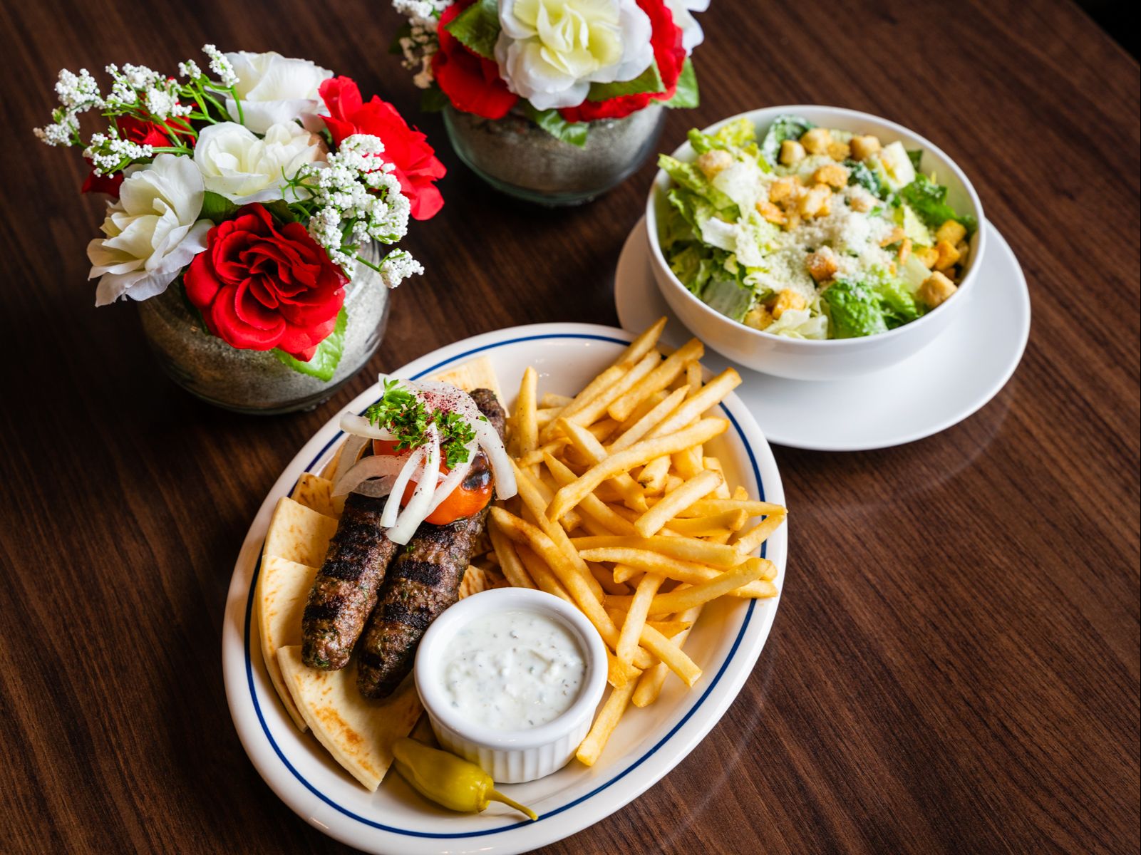 Two ground beef kabobs, served with taziki yogurt, pita bread, and your choice of two sides: salad, fries, rice, hummus, baba ganoush, tabouleh or vegetables.