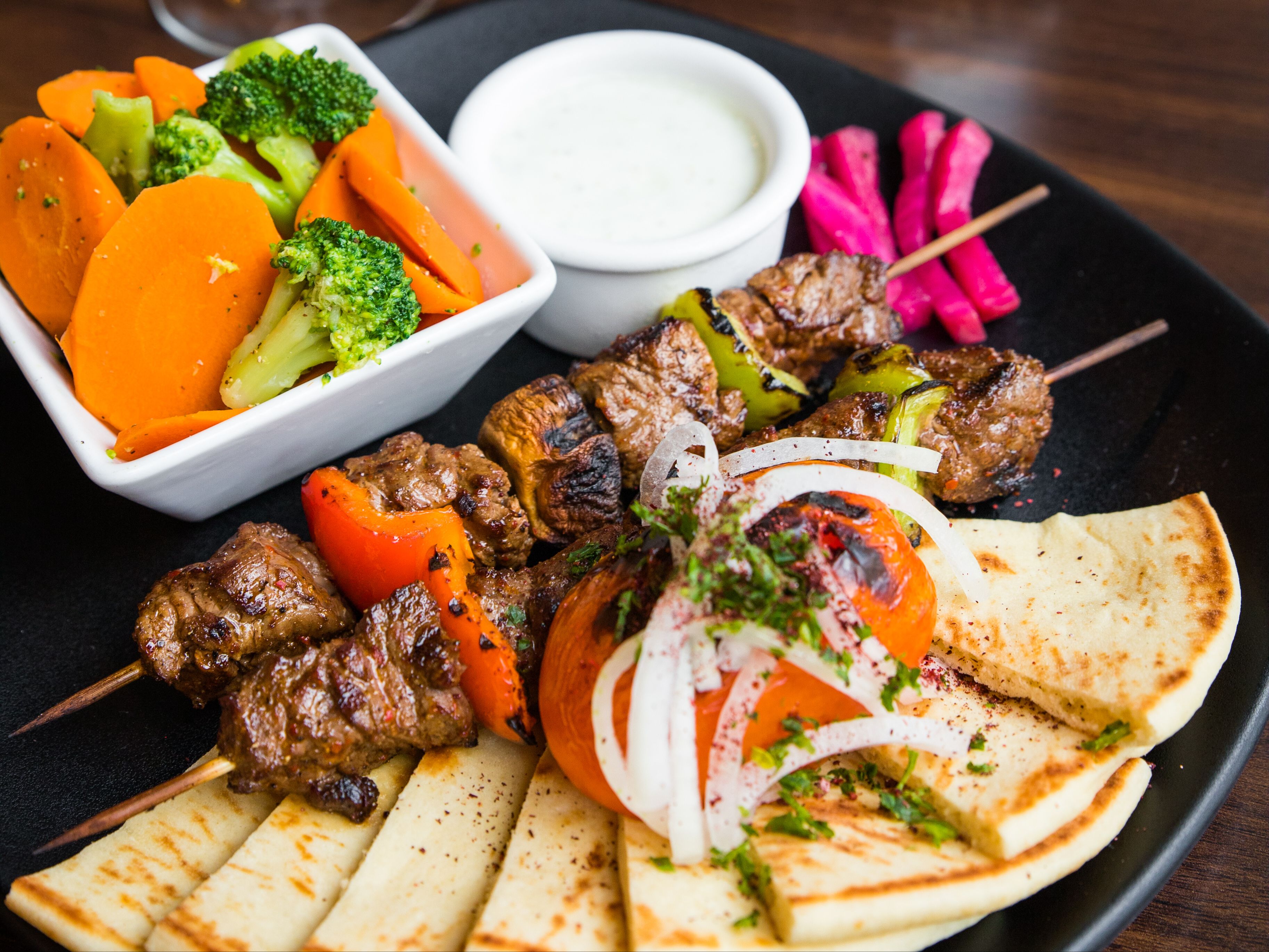 Mix Any Two Skewers. Served with taziki or garlic sauce, pita bread, and your choice of two sides: salad, fries, rice, hummus, baba ganoush, tabouleh or vegetables.